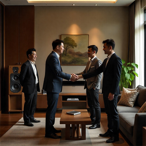 Tư vấn & mang mẫu tận nơi: Đội ngũ kỹ thuật mang các mẫu loa để anh Minh trải nghiệm trực tiếp ngay trong phòng khách.